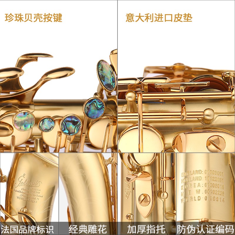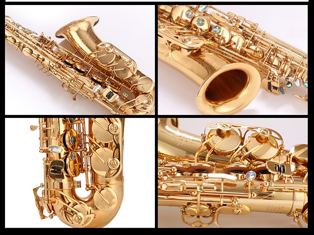 562AS沙金色中音薩克斯采用加大喇叭口,低音區全雙筋加固,全鮑魚貝殼按鍵等高配置,管體震動優良,吹奏輕松,音質通透。